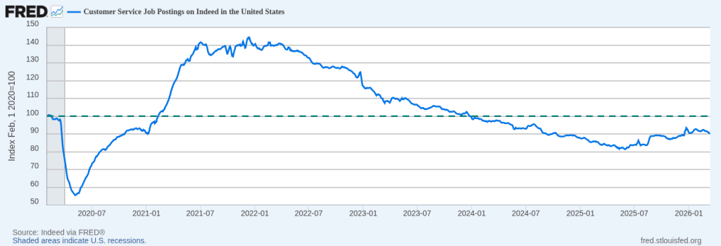 According to Dario, “two years ago AI was at the level of a smart high school student, now it’s at the level of a smart college student“1. How come then the Customer Support market is not obliterated by this point? If anything, why are the job listings bouncing back since the middle of 2025 and are now just below the pre-Covid levels (aka normal levels)2?
